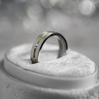 In brushed 14k or 18k gold with a center groove, offering optional gold plating. Timeless, comfortable, and enduring. Designed for a lifetime of wear.