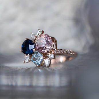 Crafted in 18k rose gold, the Serelith Cluster brings together sapphire, pink topaz, aquamarine, and diamonds in a bold yet balanced composition. A celebration of family, connection, and colour, each stone tells a story that’s uniquely yours.