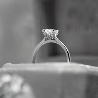 Luneth features an elongated pear cut lab grown diamond, defined by its gentle taper and fluid silhouette. Petal-shaped prongs cradle the stone with a sculptural lightness, allowing light to move freely through the facets.