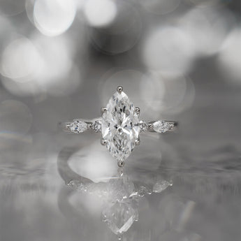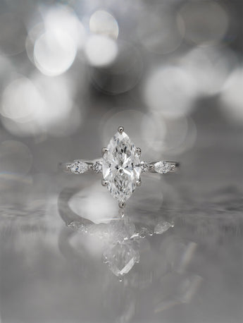 Thrya centres on a marquise cut lab grown diamond, held in petal-shaped prongs that frame the stone with a sculptural, organic touch. Tapered accent stones extend gently along the band, creating a sense of outward flow and balance.