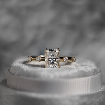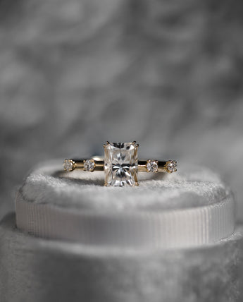 Inspired by starlit skies, the Altaira Solitaire features a radiant cut moissanite set in a classic four-prong design, with scattered stones along the band like constellations in motion.